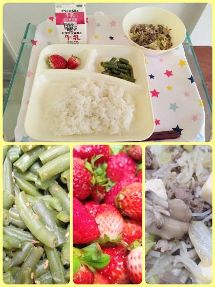 すき焼き煮 さんどまめのごまあえ いちご ごはん 牛乳