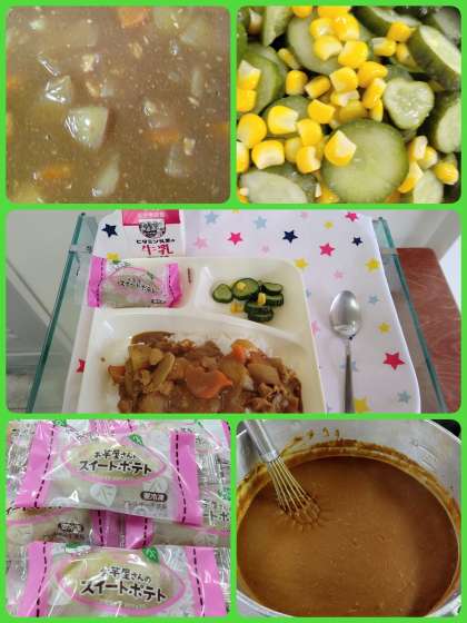チキンレバーカレーライス きゅうりとコーンのサラダ スイートポテト ごはん 牛乳