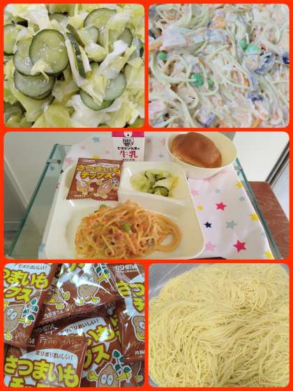 さけのクリームスパゲッティ キャベツときゅうりのサラダ おさつチップス 黒糖パン1/2 牛乳