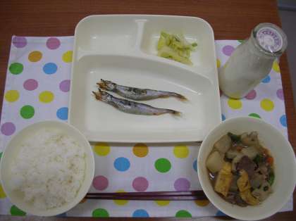 給食当番が給食を取りにきた時に「今日のししゃもは、頭から尻尾まで全部食べられるよ。」と全部のクラスに言いました。残念ながら、骨ごと全部食べられない子が予想以上にたくさんいました。「苦い。」「骨を食べるのはこわい。」「目玉は、食べられない。」と理由はいろいろでした。調理員さんがしっかり焼いてくれたので、頭もカリカリでおいしかったです。これからも「魚の骨を食べると、みんなの体の骨も強くなるよ。」と言いながら、「いわし」や「あじ」のフライの時に骨を食べると体に良いことを説明していきたいです。(栄養教諭)