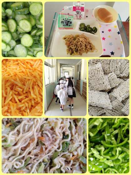 今日は、新1年生が6年生の児童といっしょに、初めて給食室に給食を取りにきました。豚肉を主材にしたソース味の『焼きそば』は、児童に人気の献立です。『きゅうりのしょうがづけ』は、蒸したきゅうりにしょうが風味のタレをかけあえています。パンとよく合う献立で美味しかったです。