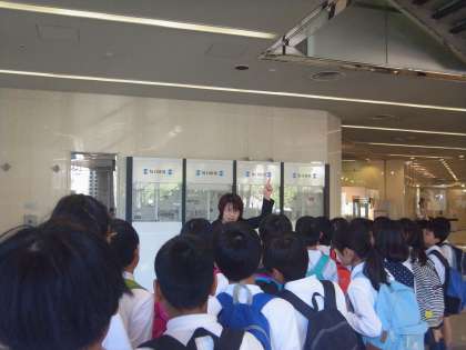 今日(5日)、5年生は、毎日新聞社へ社会見学に行きました。まずは、新聞社の仕事について、ビデオをみたり担当の方のお話を伺って学習しました。後半は、各部署で働く人々の様子や印刷工場などを見学させていただきました。大きな機械や猛スピードで運ばれるたくさんの新聞を見て、みんな驚いていました。部屋には、あちこちにたくさんの時計があって、「時間との勝負」で、仕事が進められていることを感じました。