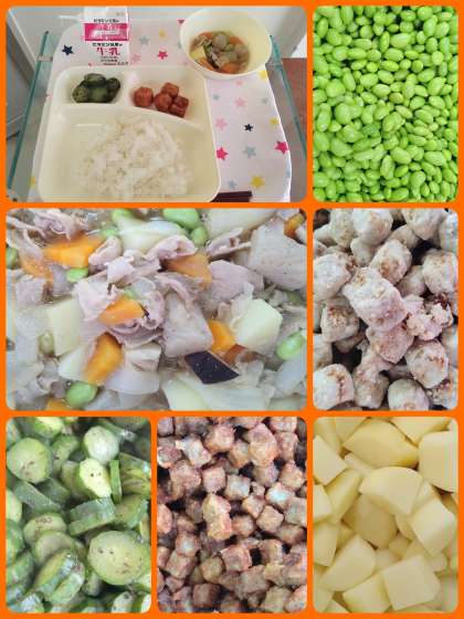 『まぐろのオーロラ煮』は、しょうが汁、料理酒で下味をつけ、でん粉をまぶし、油であげたまぐろに砂糖、赤みそで作ったタレをかけあえています。児童に大人気の献立です。『きゅうりの赤じそあえ』は、蒸したきゅうりに赤じその風味をきかせたタレであえています。豚肉と野菜の煮ものといっしょに美味しく頂きました。