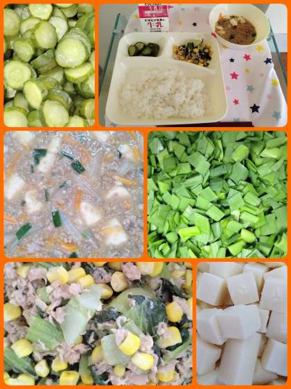 『マーボーどうふ』は、ひき肉を主材に、しょうが、にんにく、トウバンジャンを香りよくいため、にんじん、玉ねぎ、にらなどを使用した児童に人気の献立です。『ツナとチンゲンサイのいためもの』は、ツナ、チンゲンサイ、コーンを使用したいためものです。ごはんによく合い美味しかったです。
