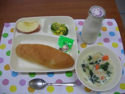 ほたて貝のクリームシチュー、ブロッコリーとコーンのサラダ、りんご、