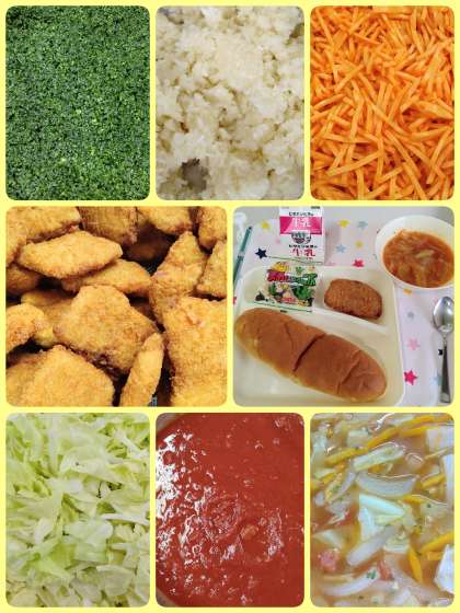 『一口トンカツ』は、サクサクでボリュームがありました。児童に大人気の献立です。『ミネストローネ』は、イタリア語で「具だくさん」と言う意味のスープです。にんにくとオリーブ油の風味がトマト味のスープによく合い美味しかったです。