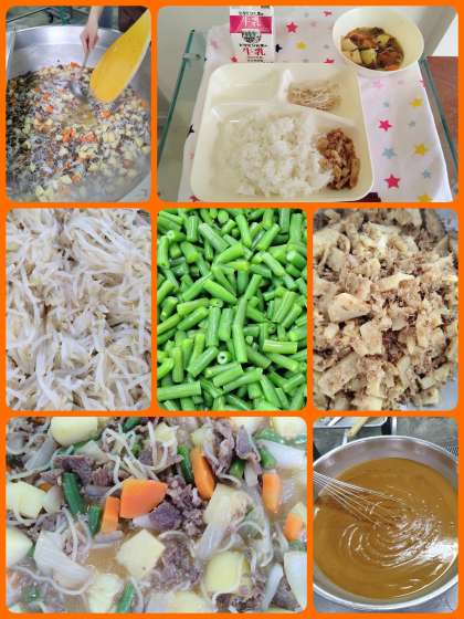 『みそ肉じゃが』は、牛肉を主材に、じゃがいも、糸こんにゃく、玉ねぎ、にんじん、さんどまめを使用したみそ味の肉じゃがです。『ごまかかいため』は、旬のたけのこをゆで、かつをぶし、いりごまをいためて味つけし、ごはんに添えて食べます。ごはんがすすむ献立で美味しかったです。