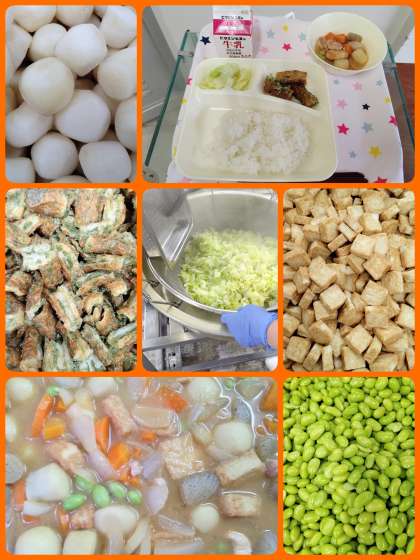 『ちくわのいそべあげ』は、児童に人気の献立です。『あつあげとさといものみそ煮』は、鶏肉を主材に、さといも、あつあげ、つなこんにゃくなどを使用し、さとう、赤みそ、しょう油で味つけして煮含めています。ごはんがすすむ献立で美味しかったです。