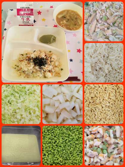 『かやくご飯』は、鶏肉、ちくわ、にんじん、さんどまめを使用しています。喫食時にご飯に混ぜ合わせ、きざみのりをかけていただきます。『まっ茶ういろう』は、新茶の季節に合わせて、まっ茶を使用しています。児童に人気のデザートです。