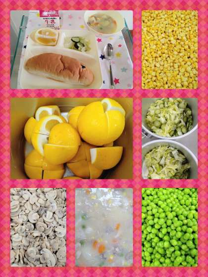 『鶏肉とコーンのシチュー』は、鶏肉とベーコンを主材に、じゃがいも、玉ねぎ、にんじん、コーン、マッシュルーム、グリンピースを使用した具だくさんのシチューです。食物アレルギーのある児童にも対応した献立になっています。『かわちばんかん』は、グレープフルーツににています。苦みが少なく、さわやかな甘みがありジューシーで美味しかったです。。