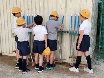 今朝、児童集会が始まる前にふと運動場を見ると、倉庫の前に子どもたちが集まり、倒れた竹馬を綺麗に並べていました。この子どもたちは、自分たちが使ったわけではありませんでしたが、竹馬がたくさん倒れていることに気づき、主体的に並べていたのです。互いに声を掛け合いながら番号順に竹馬を揃えている姿に、たいへん感心しました。
