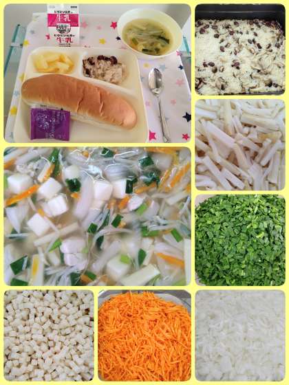 『金時豆の中華おこわ』は、もち米、焼き豚、金時豆、しめじを使用し、ごま油のコクと旨みたっぷりの一品です。『中華スープ』は、鶏肉を主材に、とうふ、玉ねぎ、もやし、たけのこ、にんじん、にらをした彩のよいスープです。