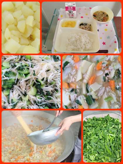 『中華煮』は、豚肉を主材に、キャベツ、玉ねぎ、たけのこ、にんじん、にらを使用した中華煮です。『チンゲンサイともやしのしょうがあえ』は、蒸したもやしと、ゆでたチンゲンサイに、しょうが風味のタレをかけあえています。ごはんがすすむ献立で美味しかったです。