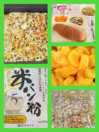 『マカロニグラタン』は、鶏肉を主材にしたグラタンです。マカロニ、パン粉は米粉のものを使用しています。クリームを使用しているのでコクがありました。『キャベツのスープ』『みかん(缶)』といっしょに美味しく頂きました。
