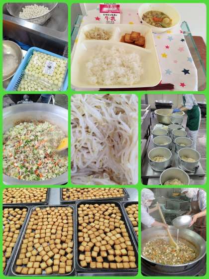 『八宝菜』は、豚肉、うずら卵、キャベツ、玉ねぎ、にんじん、たけのこ、ピーマン、しいたけを使用しています。この献立は、【卵】の除去食です。うずら卵を入れる直前にとり、個別の保温ポットで配缶します。食物アレルギーの児童も食べる事ができます。