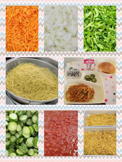 『カレースパゲッティ』は、豚ひき肉を主材に、ベーコン、トマト(缶)、ピーマン、にんにくなどを使用したカレー味のスパゲッティです。児童に大人気の献立です。『きゅうりのピクルス』は、さっぱりとした味つけで美味しかったです。