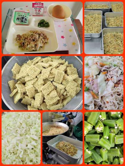 『和風焼きそば』は、豚肉を主材に、キャベツ、玉ねぎ、ピーマン、にんじんを使用した、しょう油風味の焼きそばです。『オクラの甘酢あえ』は、旬のオクラを蒸し、酸味のきいた調味液をかけあえています。「今日の給食ぜんぶすき〜」と言う児童がたくさんいました。