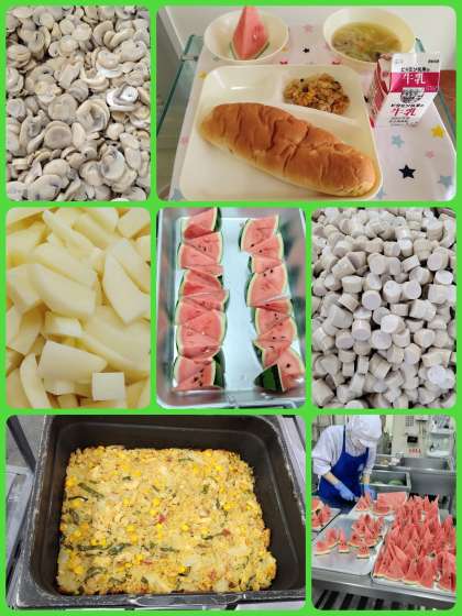 『チキンパエリア』は、スペインの代表的な料理です。コーン、ピーマン、トマト(缶)など夏野菜をたくさん使用しています。夏の旬の果物『すいか』は、1年に1回登場します。たくさんの児童が何日も前から楽しみにしていました。