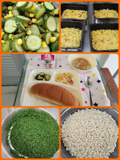 『鶏肉とてぼ豆のスープ煮』は、鶏肉を主材に、てぼ豆、キャベツ、パセリ、マッシュルームなどを使用した具だくさんのスープ煮です『ベーコンとじゃがいものチーズ焼き』は、ミニバットでの配缶になります。クラスで人数分に切り分けます。パンといっしょに美味しく頂きました。