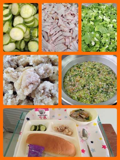 今日は、1学期最後の給食です。『鶏肉のからあげ』は、鶏肉にしょうが汁、にんにくなどで下味をつけ、あげています。サクサクにあがっていて、児童に大人気の献立です。『ハムとはるさめのスープ』は、ハムを主材に、しいたけで旨味を増し、玉ねぎ、チンゲンサイ、にんじん、はるさめを使用した具だくさんのスープです。パンといっしょに美味しく頂きました。