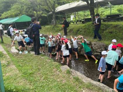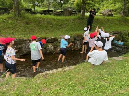 予定を変更して、川に来ました。さっきまであんなに暑かったのに今は「冷たい!」とみんなが言っています。魚つかみは明日のお楽しみです。