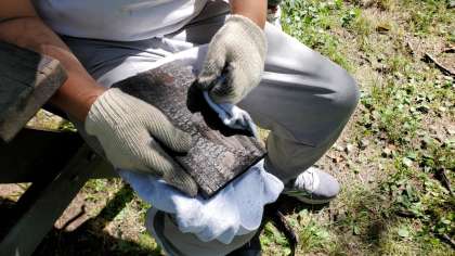 まず、杉板を古雑巾で磨き、ピカピカになった焼き板に専用の絵の具で文字や絵を描きます。