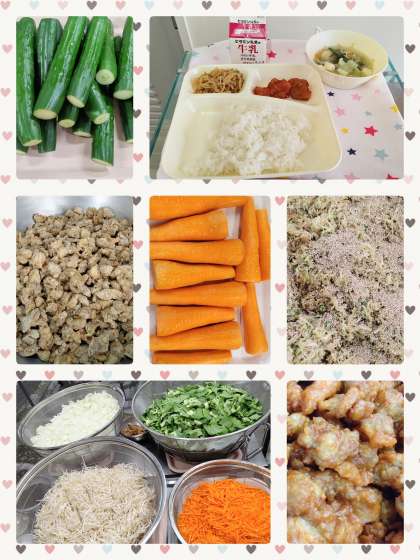 『ヤンニョムチキン』は、韓国・朝鮮の料理です。しょうが汁、にんにく、料理酒で下味をつけ、あげた鶏肉に「ヤンニョム」という甘辛いタレをからめています。児童に大人気の献立です。『切干しだいこんのナムル』は、蒸したきゅうりと切り干しだいこんに、砂糖、塩、こいくちしょうゆ、ごま油、いりごまで作ったタレをかけあえています。『とうふのスープ』といっしょに美味しく頂きました。