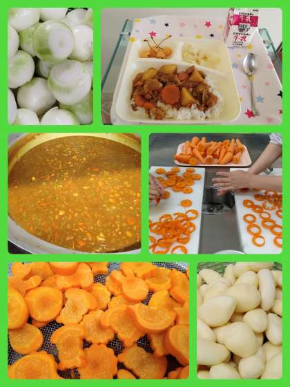 『チキンカレーライス』は、鶏肉を主材にした毎回好評なカレーライスです。今日は、ラッキーにんじんの日でした。調理員さんがクマ、うさぎ、とり、星などにんじんを色々な形にくりぬいてくれました。『キャベツとコーンのサラダ』は、さっぱりとした味つけで美味しかったです。