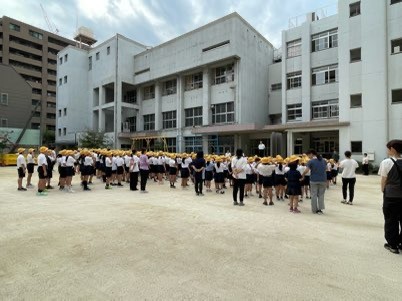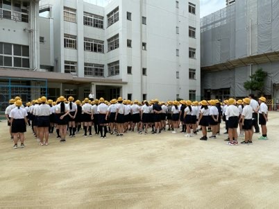 今まで暑くて外でできませんでしたが、やっと涼しくなり外で児童朝会ができるようになりました。運動場の資材も減ってきたので、外でもたくさん遊んでほしいと思います。