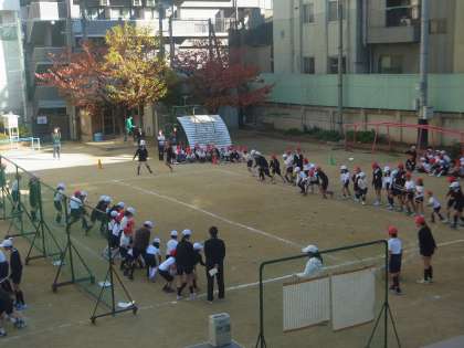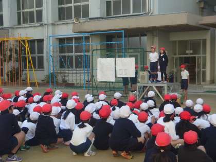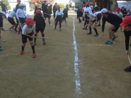 今日(8日)の2時間目、全校集会を行いました。今年は、たてわり班対抗「ホッケー大会」でした。新聞紙で作ったスティックとボールを使って、相手コートにボールを入れ合うゲームです。スティックの先をしっかりボールに当てないと、うまく転がりません。空振りするたび、「あー!」という声があちこちから聞こえていました。たてわり班で協力し、いくつのボールを相手コートに入れることができるか・・・。みんなとても楽しんでいました。