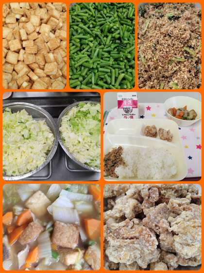 『鶏肉のたつたあげ』は、毎回児童に好評な献立です。鶏肉に、しょうが汁、料理酒、こい口しょう油で下味をつけ、あげています。鶏肉に、しょうが汁の風味もしっかりついていていました。『おかかなっ葉』は、かつおぶし、だいこん葉をいためみりん、こい口しょう油で味をつけいりごまを加えています。ごはんがすすむ献立で美味しかったです。