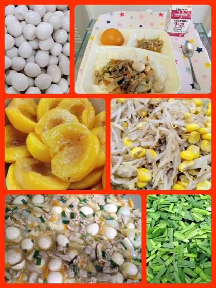 『中華丼』は、うずら卵の除去食です。個人用の保温ポットに入れて配缶します。『もやしとコーンのごまいため』は、ごま油でもやし、コーンをいため、塩、こしょう、うすくちしょう油で味つけし、いりごまを加えていためています。デザートに黄桃(缶)がつきました。ほどよい甘さで美味しかったです。