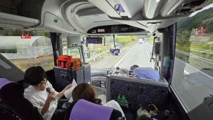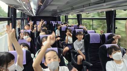 バスの中では、子どもたちが考えたクイズやなぞなぞを先生が出題しています。