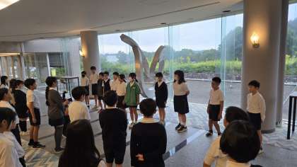 天候により朝の会の場所を変更し、ロビーに集合しました。