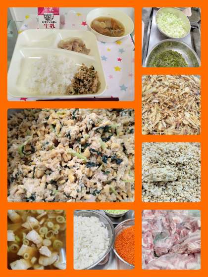 鶏肉のゆず塩焼き ソーキ汁 ツナ大豆そぼろ ごはん 牛乳