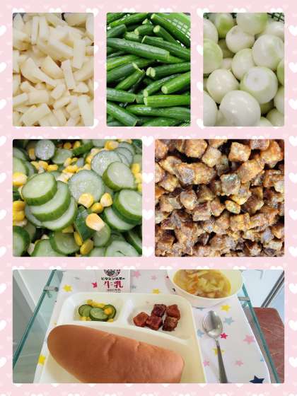 『まぐろのオーロラ煮』は、しょうが汁で下味をつけたまぐろに、でん粉をまぶして油であげ、ケチャップ、赤みそで作ったタレをかけあえています。児童に大人気の献立です。『スープ』は、ベーコンを主材に、玉ねぎ、にんじん、じゃがいもを使用した野菜の旨みたっぷりのスープです。パンといっしょに美味しく頂きました。