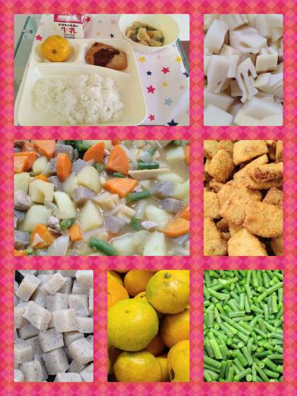 『みそカツ』は、一口トンカツをあげ、八丁みそ、赤みそ、などで作ったタレをかけあえています。愛知県を中心とした地方の料理です。児童に大人気の献立です。『じゃがいもと野菜の煮もの』は、鶏肉を主材に、たけのこ、じゃがいも、こんにゃく、にんじんなどを使用した煮ものです。具材に味がしみこんでいて美味しかったです。