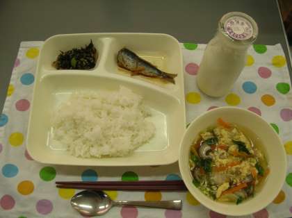 今日は、「いわし」「ひじき」といったカルシウムたっぷりの食材を使った献立でした。「いわし」は中骨がありました。「先生、骨は食べられるんですか?」と子どもにきかれました。「しっかり噛むと食べられるよ。食べるとみんなの体の骨になるよ。」と言うと、骨だけで食べ「先生、コリコリしておいしかった。」と空になったお皿を見せてくれました。1人だけでなく、何人もいました。「ししゃも」の骨も嫌がる子どもがいますが、今日の「いわし」は「焼きししゃも」より骨を食べようとしていました。うれしかったです。(栄養教諭)