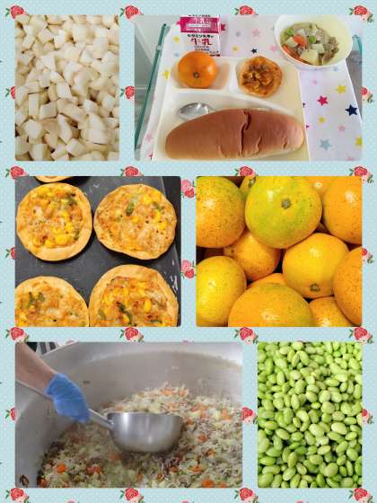 『豚肉と野菜のスープ煮』は、豚肉を主材に、じゃがいも、玉ねぎ、キャベツ、にんじん、マッシュルーム、むきえだまめを使用した洋風の煮ものです。『変わりピザ』は、ぎょうざの皮に具材をのせて焼いています。児童に人気の献立です。みかんといっしょに美味しくいただきました。