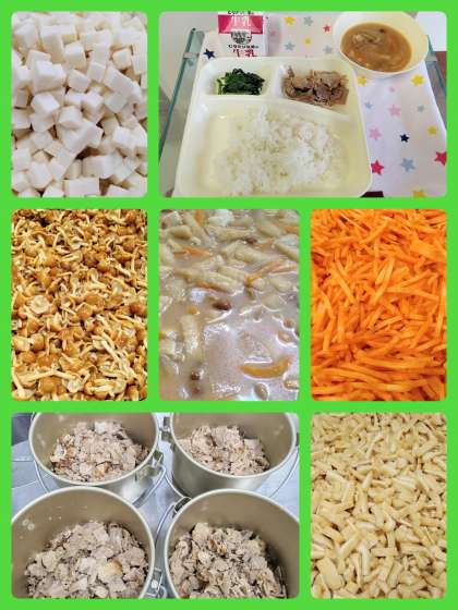 『豚肉のしょうが焼き』は、ごはんがすすむ一品です。『なめこのみそ汁』は、なめこ、とうふ、うすあげ、だいこん、にんじんを使用しています。とろっとしたなめこと、つるっとしたとうふのあいしょうがよく美味しかったです。