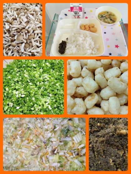 『五目汁』は、鶏肉、だいこん、しめじ、青ねぎなどを使用し、おだしの風味をいかした汁ものです。『のりのつくだ煮』は、かつおぶし、しいたけ、きざみのりを使った、ごはんによく合う手作りのつくだ煮です。『いかてんぷら』といっしょに美味しく頂きました。