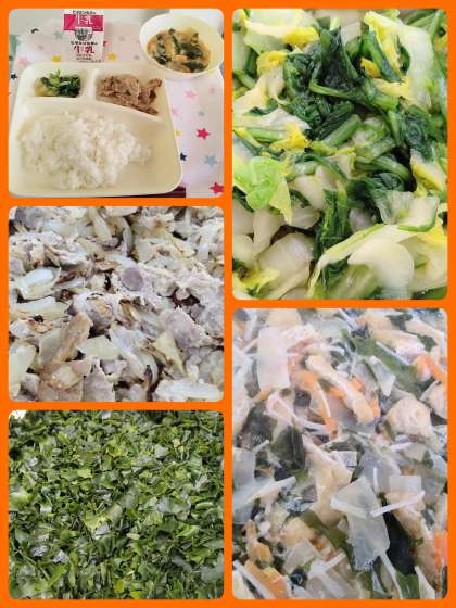 『みそ汁』は、にぼしでだしをとり、うすあげ、だいこんなどを使用しています。にぼしのだしは香りが強く濃厚な風味でみそ汁と、とても相性が良いです。『きくなとはくさいのおひたし』は、ゆでた旬のはくさいときくなを使用しています。ごはんによく合う献立で美味しかったです。