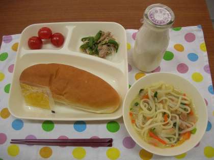 今日もとても寒かったです。給食の「五目うどん」で温まることができました。白菜、たまねぎ、にんじん、青ねぎ、鶏肉、うすあげを使った具だくさんのうどんでした。「だしこんぶ」と「けずりぶし」でとった出汁がきいていて、とてもおいしかったです。子どもたちにも好評でした。(栄養教諭)