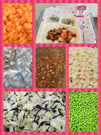 『ハヤシライス』は、牛肉を主材に、じゃがいも、玉ねぎ、にんじん、セロリ、グリンピースなどを使用しています。今日は、ラッキーにんじんの日です。熊や鳥、花など色々な形にくりぬいたにんじんが入っています。『キャベツのひじきドレッシング』は、蒸したキャベツに、調理員さん手づくりの、ひじきを使用したドレッシングをかけあえています。少し酸味があり美味しかったです。