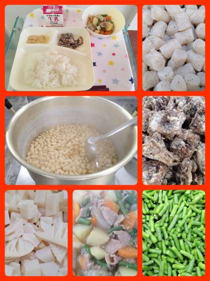 今日は、1年に1回登場する『くじらのたつたあげ』がでました。『豚肉とじゃがいもの煮もの』は、豚肉を主材に、じゃがいも、つなこんにゃく、玉ねぎ、たけのこ、にんじん、さんどまめを使用した具だくさんの煮ものです。彩りもよく美味しかったです。