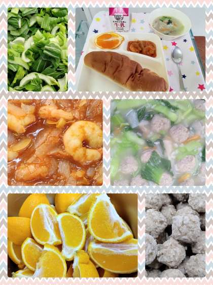 『えびのチリソースいため』は、ぷりぷりのえびに、ピリとしたチリソースがしっかりからまり美味しかったです。『中華がゆ』は、肉だんご、だいこん、にんじん、しいたけ、チンゲンサイ、お米を使用した児童に人気の献立です。パンによく合う献立でした。