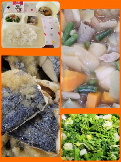 さごしのおろしじょうゆかけ さといもと野菜の含め煮 なのはなのおひたし かつおぶし(袋) ごはん 牛乳