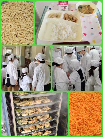 『焼きとり』は、しょうが汁、綿実油で下味をつけた鶏肉と白ネギを混ぜ合わせて焼き、甘辛いタレをかけあえています。児童に人気の献立です。『みそ汁』は、豚肉、うすあげ、玉ねぎ、キャベツ、にんじん、わかめを使用した具だくさんのみそ汁です。今日は、1年生の児童が初めて給食室に給食を取りに来ました。6年生の児童のサポートにより、とてもスムーズに用意ができました。