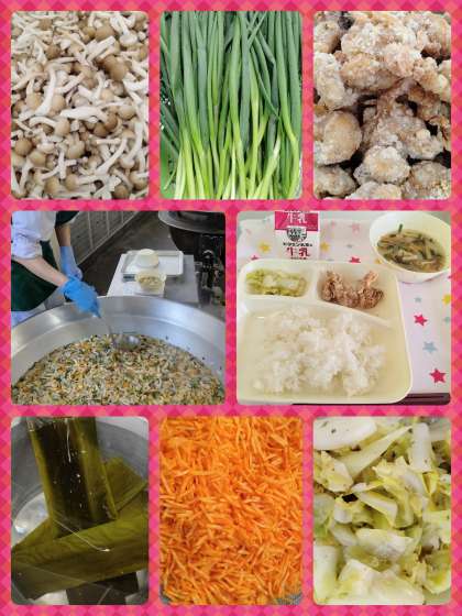 『鶏肉のたつたあげ』は、しょうが汁の下味がしっかりとついていました。児童に人気の献立です。『五目汁』は、うすあげ、しめじ、青ねぎなどを使用した具だくさんの汁ものです。ごはんによく合う献立で美味しかったです。