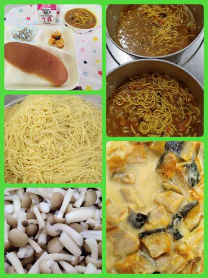 『カレースープスパゲッティ』は、鶏肉とベーコンを主材にしたカレー味のスパゲッティです。児童に人気の献立です。『かぼちゃのマリネ焼き』は、甘みのあるかぼちゃに野菜ブイヨン、ノンエッグドレッシングで下味をつけ、焼いています。コクとまろやかさがまし美味しかったです。